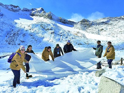 四川阿壩州,中國科學(xué)院西北生態(tài)環(huán)境資源研究院科研人員在為冰川“蓋被子”。謝宜達攝/光明圖片