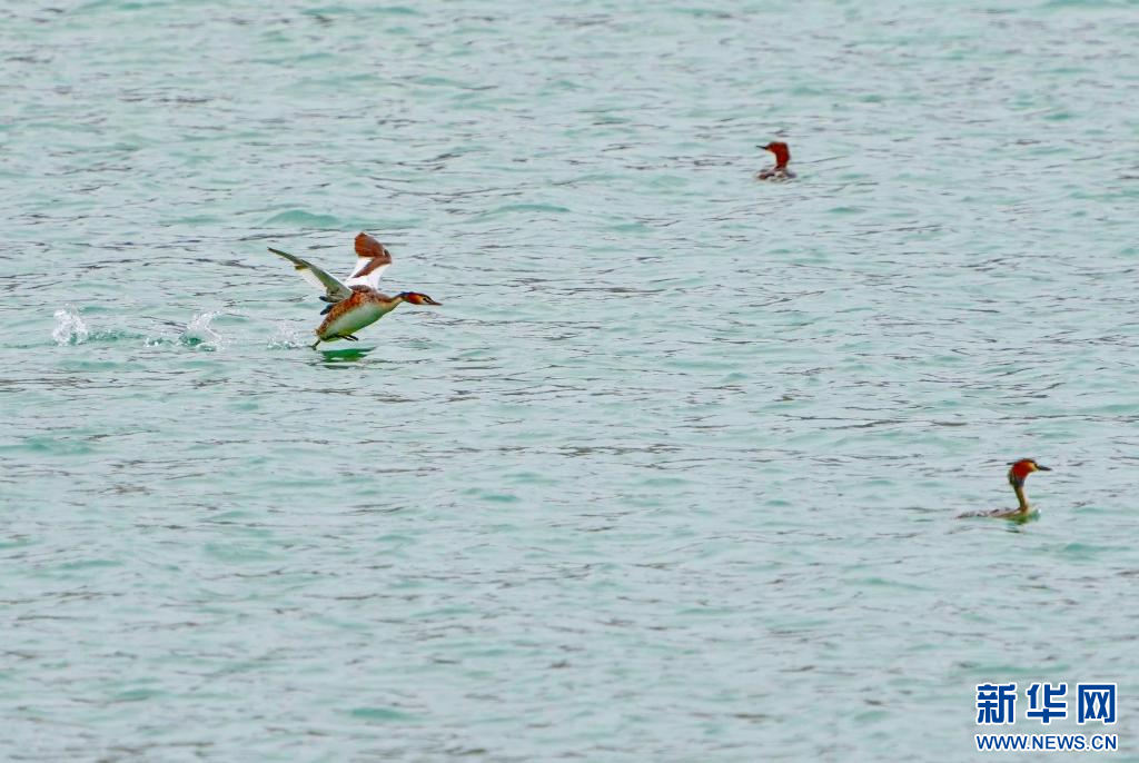 鳳頭 在虎頭山水庫(kù)的水面上飛翔(4月24日攝)。新華社記者 張汝鋒 攝