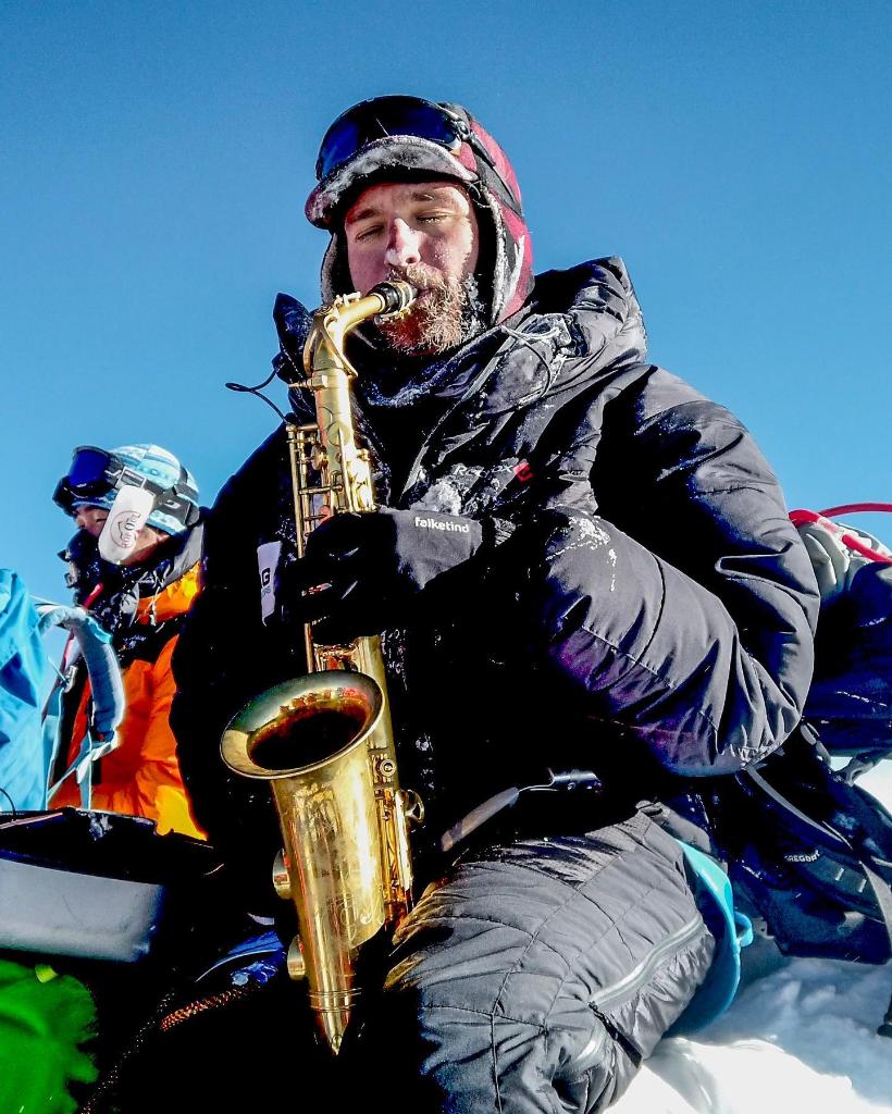2019年哈康·埃蘭森從南坡登頂珠峰后在頂峰吹奏薩克斯(受訪(fǎng)者供圖)