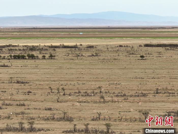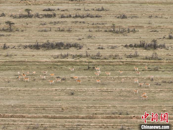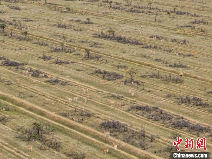 6月5日,航拍成群普氏原羚在位于青海湖北岸的青海省海北藏族自治州剛察縣哈爾蓋鎮(zhèn)境內的草原上漫步。普氏原羚是世界上最瀕危的野生動物之一,現(xiàn)僅分布于青海湖環(huán)湖部分區(qū)域,是青海湖旗艦物種。目前,普氏原羚野外種群數(shù)量從監(jiān)測之初不足300只恢復至3400余只。(無人機照片)馬銘言 攝