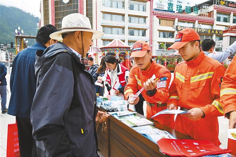 活動(dòng)現(xiàn)場,波密縣森林消防中隊(duì)消防員通過發(fā)放防災(zāi)減災(zāi)宣傳資料、講解安全生產(chǎn)常識的形式,向過往群眾宣傳普及森林火災(zāi)、洪澇、山體滑坡、地震等自然災(zāi)害以及逃生自救、互救知識和技能。