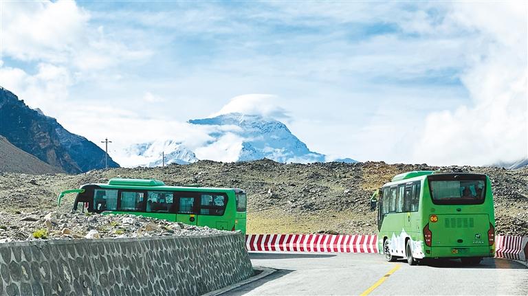 圖為載滿(mǎn)游客的清潔能源環(huán)保客車(chē)前往珠峰大本營(yíng)。記者 格桑倫珠 攝
