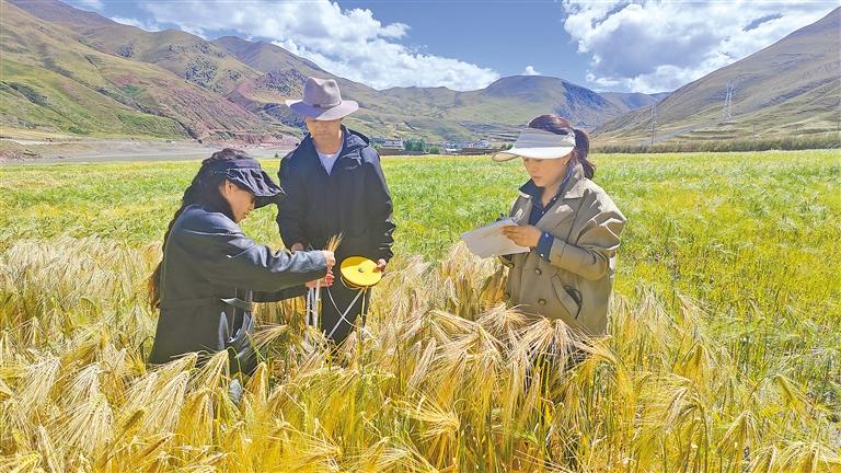圖為比如縣相關工作人員在田間開展青稞測產分析工作。記者 萬靖 攝