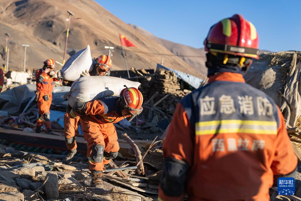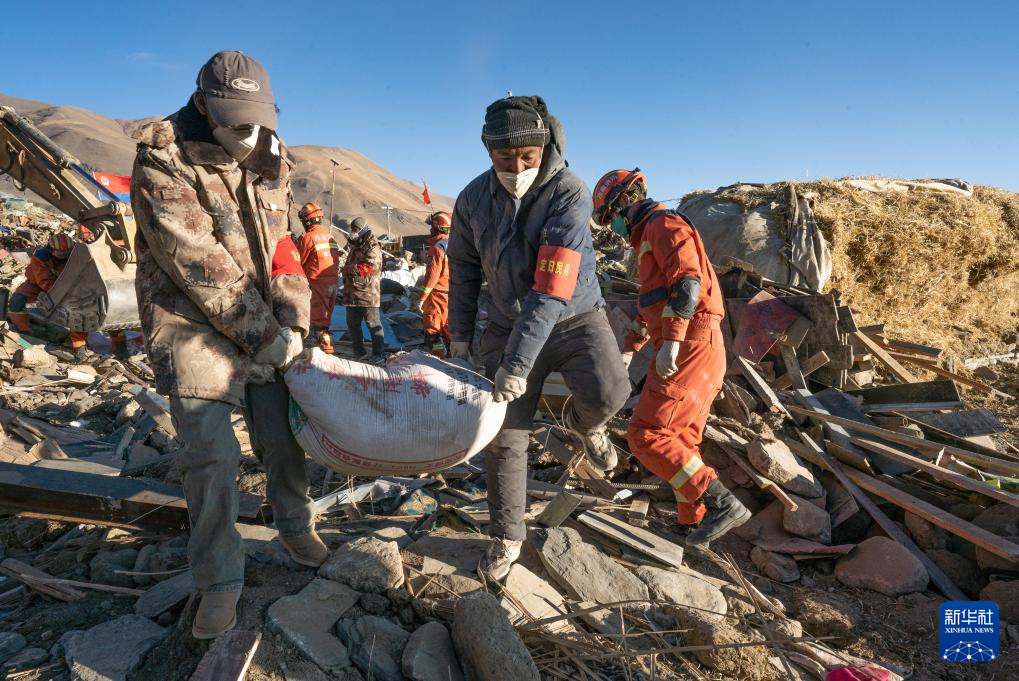 1月13日,在定日縣長(zhǎng)所鄉(xiāng)古榮村,消防員們?cè)诎徇\(yùn)青稞。新華社記者 丁增尼達(dá) 攝