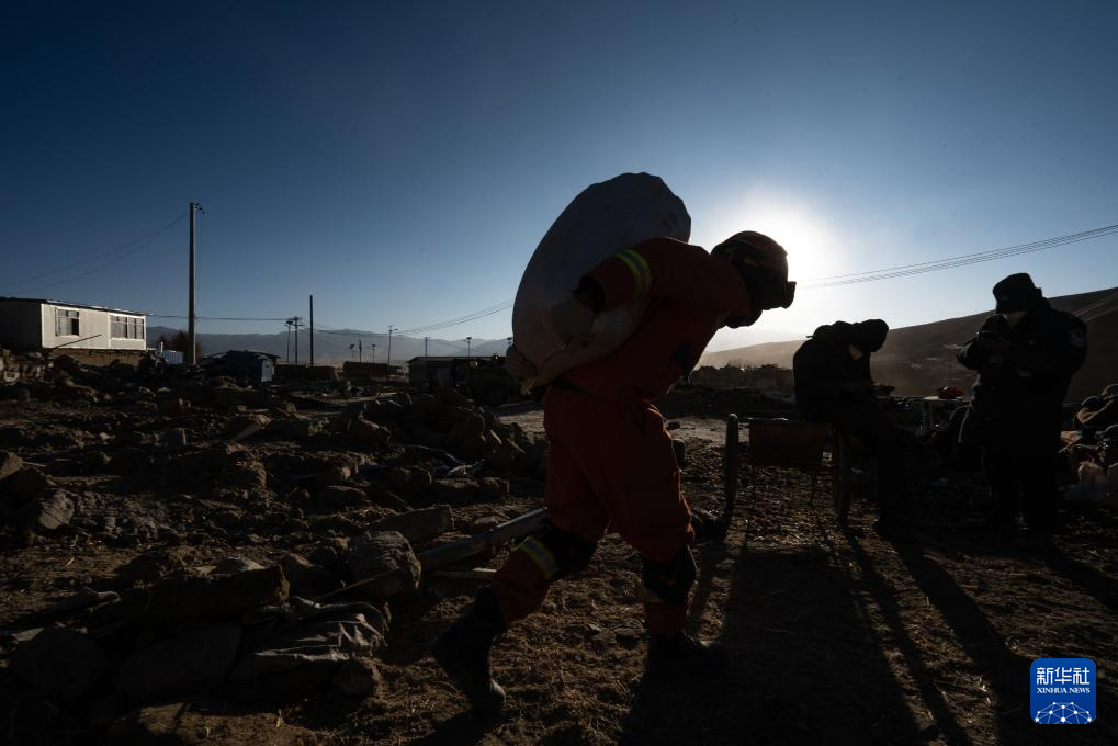 1月13日,在定日縣長(zhǎng)所鄉(xiāng)古榮村,消防員在搜尋次仁扎西老人家里的青稞。新華社記者 丁增尼達(dá) 攝