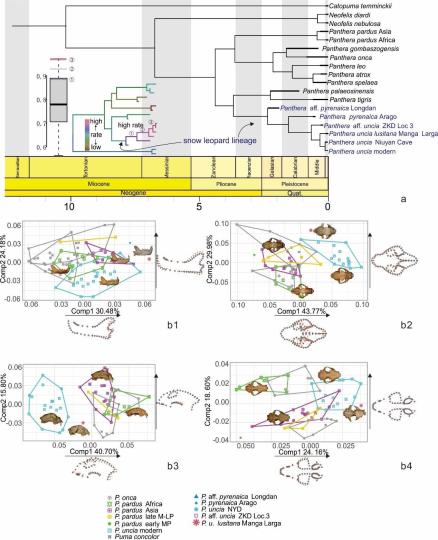 江左其杲指出,結合DNA序列和形態(tài)學數(shù)據(jù),研究團隊推斷豹屬的系統(tǒng)發(fā)育,支持5例化石記錄的確屬于現(xiàn)生雪豹支系,且它們相對現(xiàn)生雪豹組成并系群,表明這些青藏高原之外的雪豹并非獨立于現(xiàn)生雪豹的一個分支,而是不斷從雪豹主干上分出的小分支,說明它們很有可能代表雪豹多次在特定時間段走出青藏高原的記錄,而這些記錄共同組成了雪豹演化的幾個斷面,從而得以揭秘雪豹如何一步步特化。