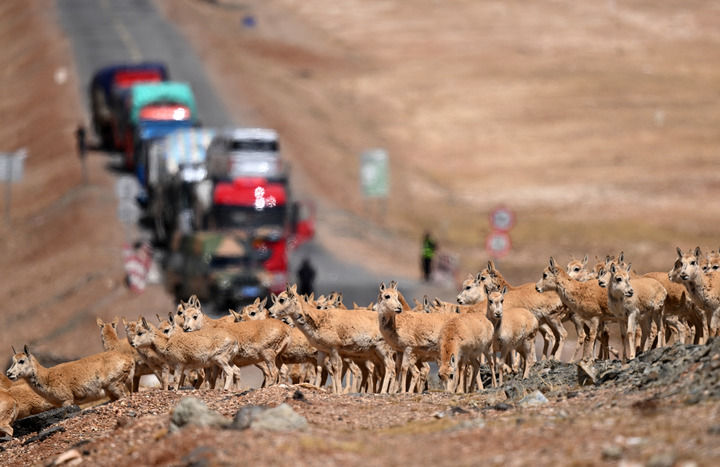 一群待產雌性藏羚羊通過青藏公路前往可可西里卓乃湖產仔(2023年5月29日攝)。新華社記者 張宏祥 攝