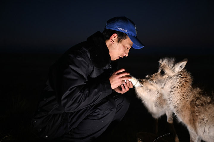 可可西里巡山隊隊員才文多杰在索南達杰保護站內給被救助的藏羚羊幼仔喂奶(2024年1月18日攝)。新華社記者 張宏祥 攝