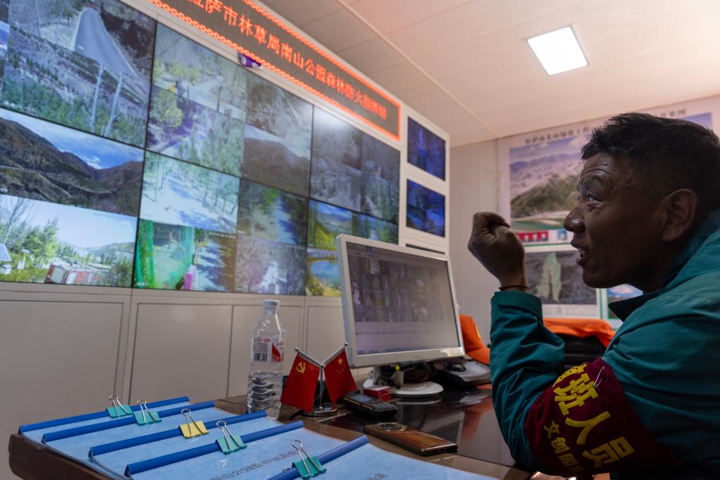 拉薩南山公園園區(qū)護林員扎西曲培正在監(jiān)控室觀察園區(qū)各處情況(3月20日攝)。新華社記者姜帆 攝