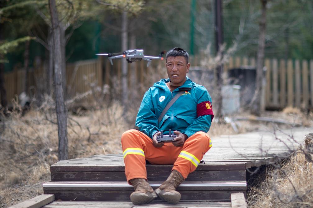 拉薩南山公園園區(qū)護林員扎西曲培正在操控?zé)o人機(3月20日攝)。新華社記者姜帆 攝