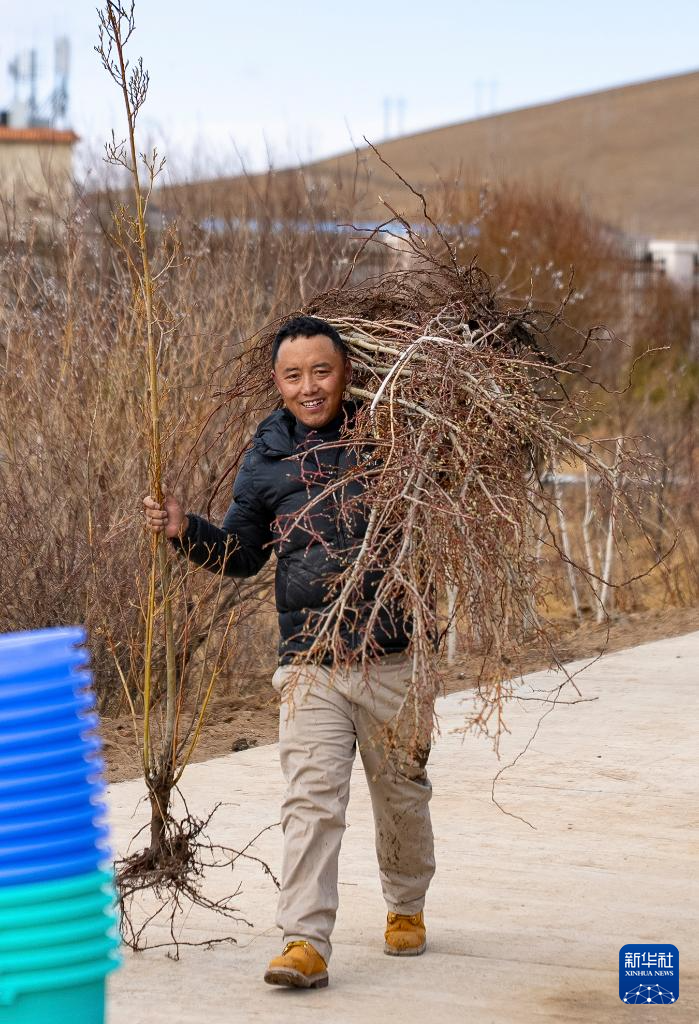 4月25日,當(dāng)?shù)厝罕娫诎徇\樹苗。新華社記者 丁增尼達 攝