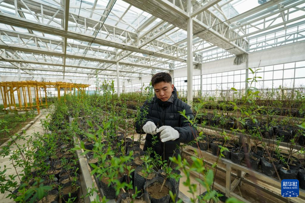 4月25日,那曲市林業(yè)和草原局工作人員在那曲高寒高海拔鄉(xiāng)土樹種培育基地給樹苗剪枝。新華社記者 晉美多吉 攝