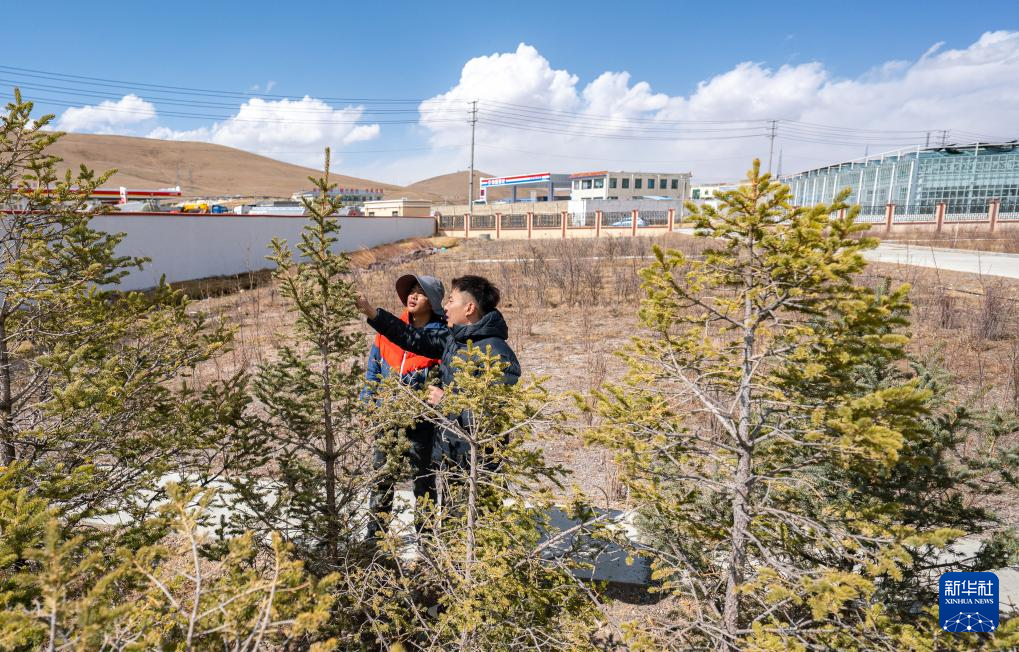 4月25日,那曲市林業(yè)和草原局工作人員在檢查樹木長勢。新華社記者 丁增尼達 攝