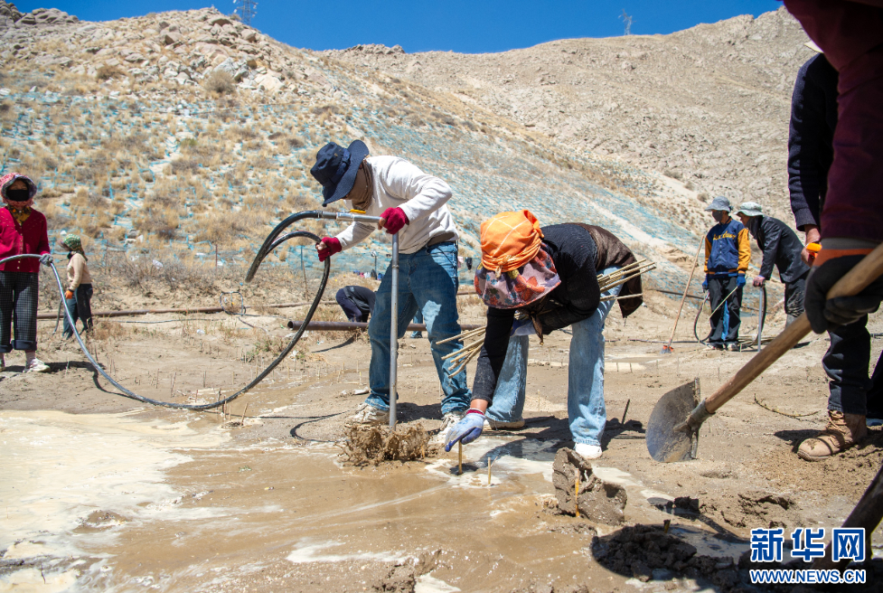 4月24日,在拉薩南北山造林綠化(貢嘎段)西藏森拓雅公司造林片區(qū),當(dāng)?shù)卮迕裨谠詷?。新華網(wǎng) 旦增努布 攝
