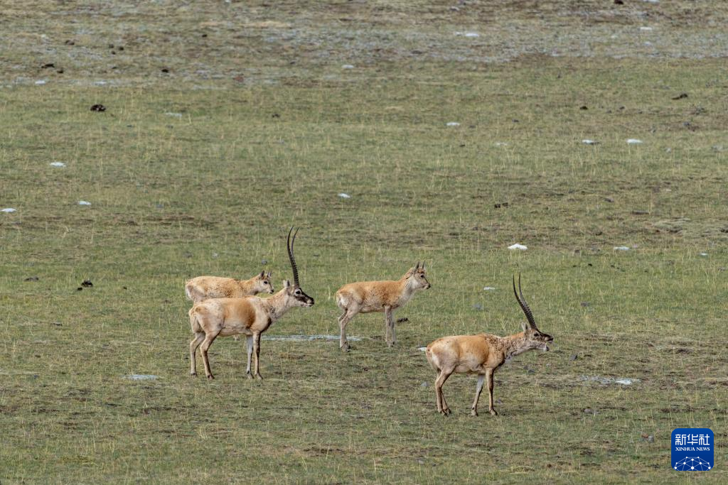 在羌塘國(guó)家級(jí)自然保護(hù)區(qū)核心區(qū)拍攝到的雄性和亞成體雌性藏羚羊(6月9日攝)。新華社記者 旦增尼瑪曲珠 攝