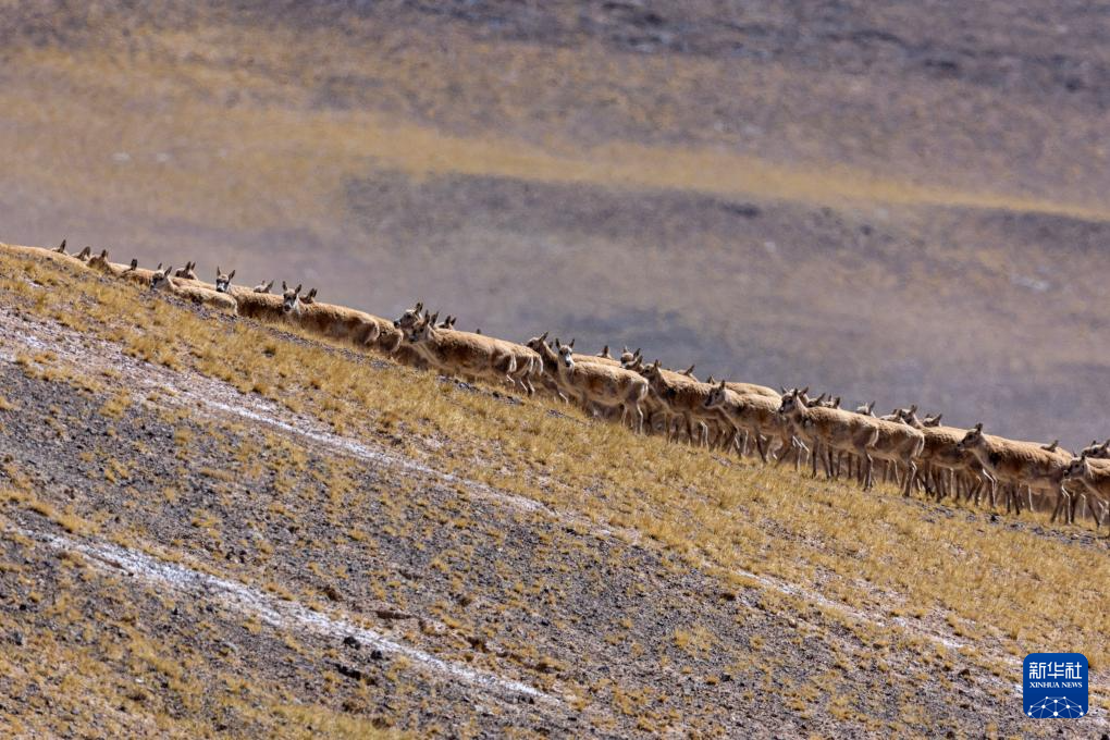 在羌塘國(guó)家級(jí)自然保護(hù)區(qū)核心區(qū)拍攝的遷徙中的雌性藏羚羊群(6月8日攝)。新華社記者 旦增尼瑪曲珠 攝