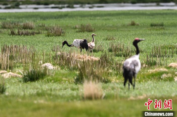 7月10日,在海拔4700米的西藏自治區(qū)那曲市申扎縣濕地里,黑頸鶴一家在悠閑覓食。中新社記者 貢嘎來松 攝