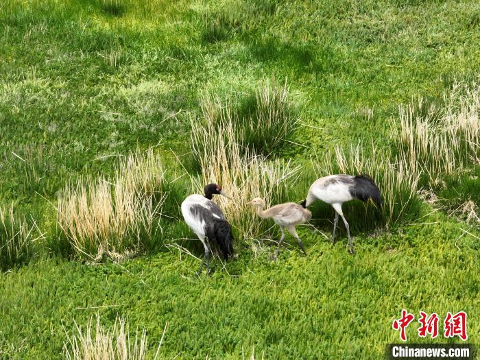7月10日,在海拔4700米的西藏自治區(qū)那曲市申扎縣濕地里,黑頸鶴一家在悠閑覓食。黑頸鶴是中國(guó)國(guó)家一級(jí)重點(diǎn)保護(hù)野生動(dòng)物,屬高原特有鶴類,主要棲息于海拔2500米至5000米的高原沼澤地、湖泊及河灘等濕地環(huán)境。每年四月起,成對(duì)的黑頸鶴陸續(xù)飛抵西藏自治區(qū)那曲市申扎縣,在此繁育后代。近年來,申扎縣持續(xù)加強(qiáng)生態(tài)修復(fù),濕地面積擴(kuò)大、水質(zhì)改善,為黑頸鶴等珍稀物種提供了理想家園。中新社發(fā) 毛建軍 攝