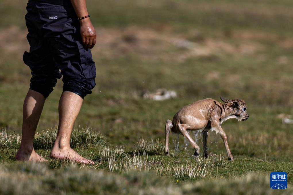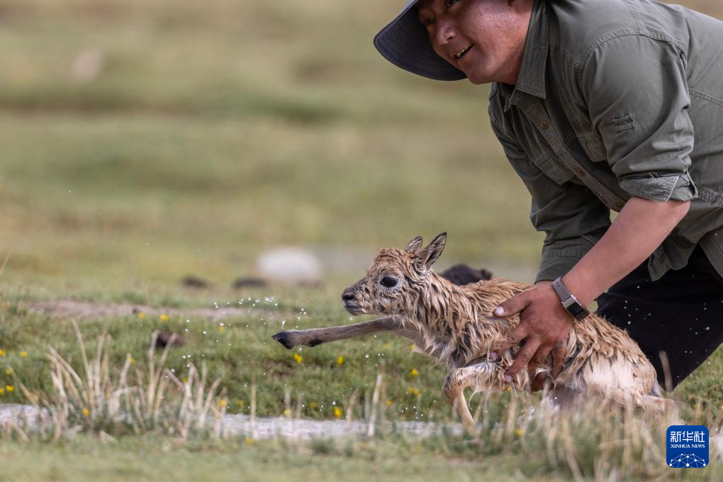 一只被激流沖走的藏羚羊幼崽被管護(hù)隊(duì)員救上岸(7月14日攝)。新華社記者 姜帆 攝