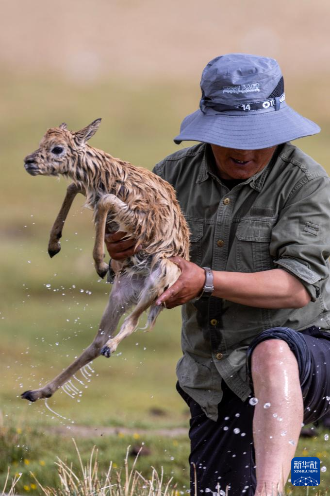 這是一只剛被管護(hù)隊(duì)員救上岸的藏羚羊幼崽(7月14日攝)。新華社記者 姜帆 攝