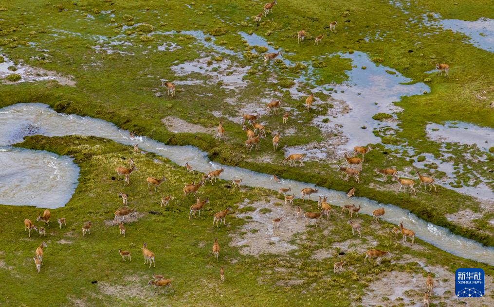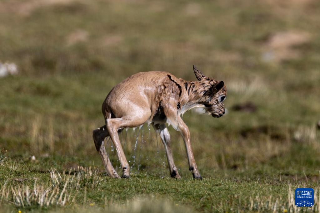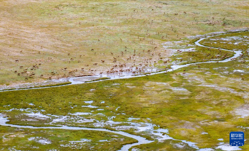 一群帶著幼崽的藏羚羊成功渡過森隆藏布河,幼崽身上水跡未干(7月15日攝)。新華社記者 姜帆 攝