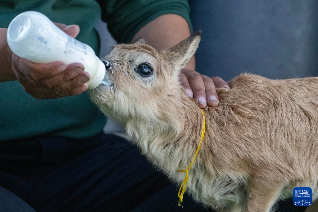 措羅木管理站站長阿旺洛卓在給藏羚羊幼崽喂奶(7月16日攝)。新華社記者 姜帆 攝