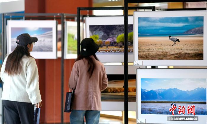 圖為觀眾欣賞黑頸鶴主題攝影展中的作品。李林 攝