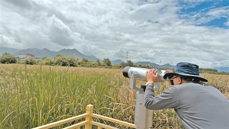 市民在拉魯濕地公園內通過望遠鏡觀賞布達拉宮。
