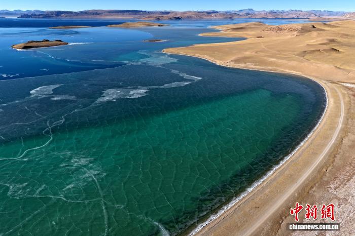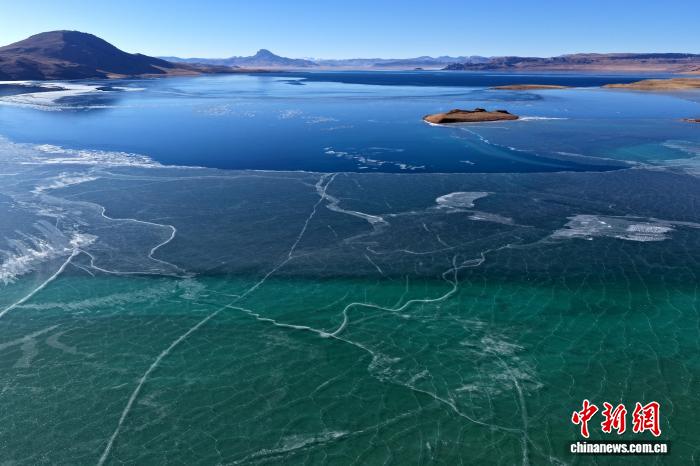 12月20日,航拍錯鄂湖。錯鄂湖,位于西藏那曲市申扎縣境內(nèi),是色林錯的衛(wèi)星湖。冬日錯鄂湖在陽光照耀下,湖泊呈現(xiàn)藍、綠等多種顏色,景色迷人。圖為錯鄂湖景色。(無人機照片)中新社記者 李林 攝