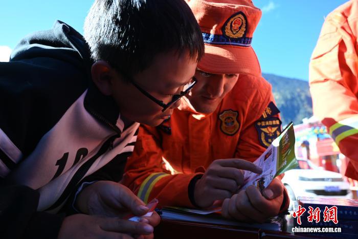 圖為指戰(zhàn)員給小朋友講解防火知識(shí)。仁青旺堆 攝