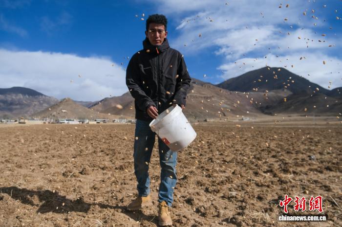 2月8日,西藏拉薩林周縣黑頸鶴巡護(hù)員桑珠在田間播撒小麥,為黑頸鶴補(bǔ)充食物。中新社記者 江飛波 攝