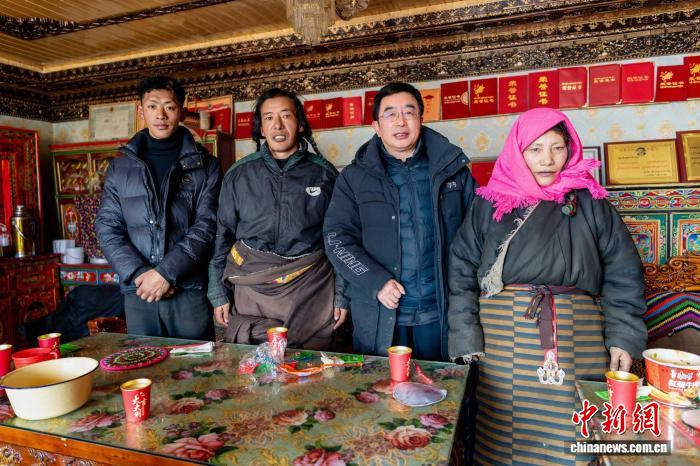 2025年12月21日,連玉明(右二)走進(jìn)海拔5300米的長(zhǎng)江源頭牧民家中調(diào)研,并與牧民一家合影。受訪者供圖