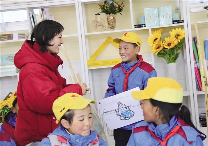 美術教室布置之初,從一年級到六年級,二三十名學生追到新教室,拿著彩筆在墻上畫出一幅幅稚嫩卻充滿童趣的圖畫?!拔蚁氘嬕粋€城堡,給它圖上美麗的顏色!”“我要把牦牛畫在墻上?!薄拔乙媯€飛行員”……