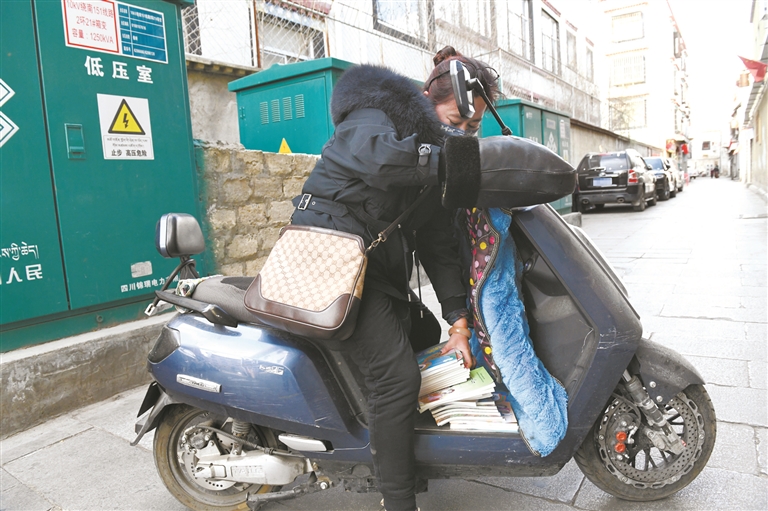 圖為城關(guān)區(qū)第二小學(xué)三年級(jí)(11)班班主任旦增色珍騎著電動(dòng)車(chē)把分類(lèi)分揀好的教材送到學(xué)生家中。