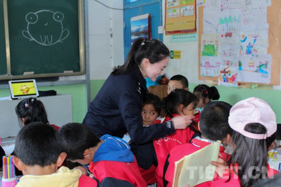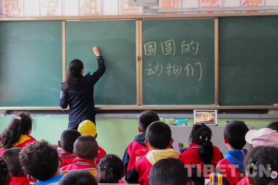 圖為派出所民警耐心地為孩子授課 攝影:次仁吉啦