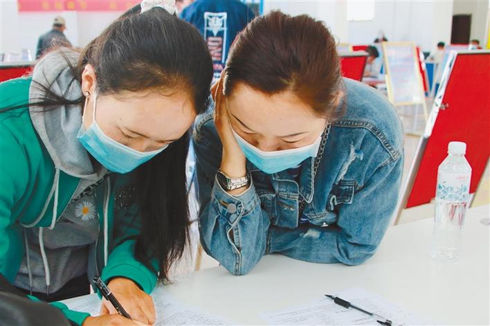 圖為應(yīng)聘者在填寫報名表。記者 段敏 攝