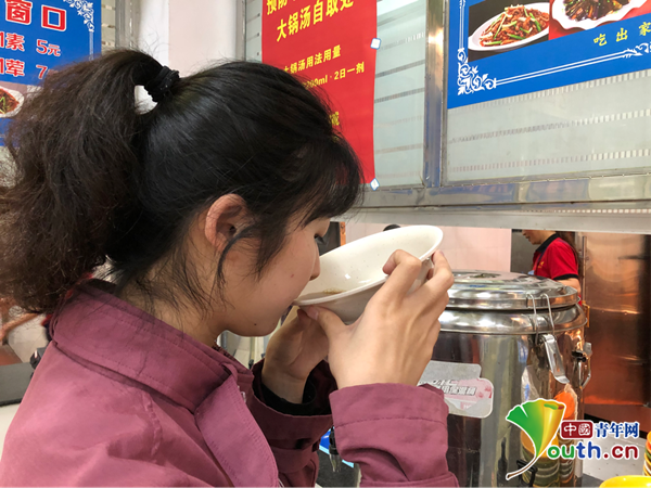 圖為學(xué)生正在飲用“大鍋湯”。中國青年網(wǎng)通訊員 沈萌萍 攝