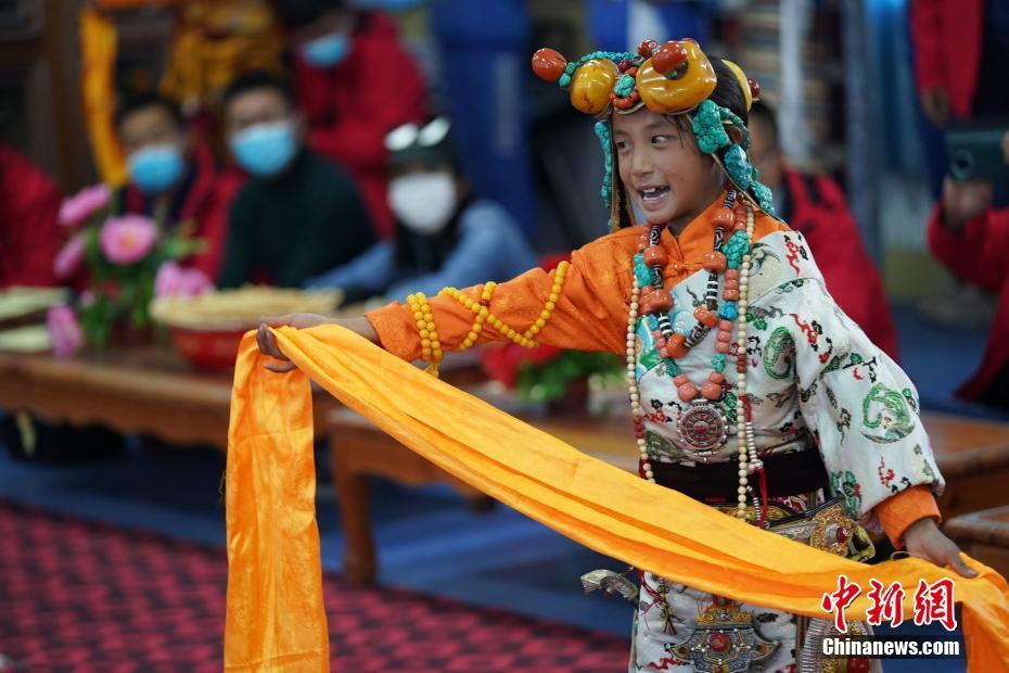 格薩爾史詩是聯(lián)合國教科文組織非物質(zhì)文化遺產(chǎn)。青海省雜多縣第二民族完全小學(xué)自2016年起組建格薩爾文化傳承班,這其中包括環(huán)保班級、格薩爾書法班級、哈達(dá)說班級等九種類型。圖為10月14日,該校小學(xué)生表演格薩爾史詩說唱藝術(shù)。中新社記者 蘇丹 攝