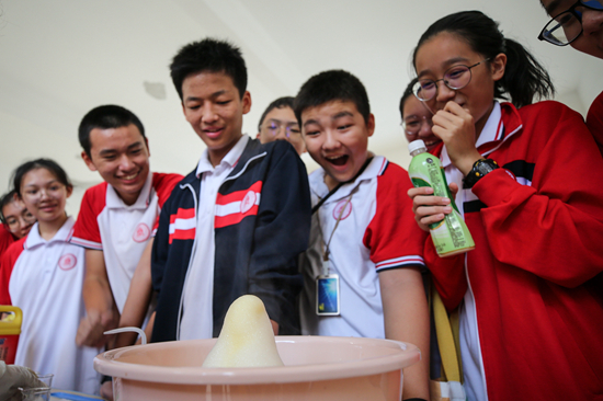 10月26日,北京師范大學(xué)海口附屬學(xué)校的學(xué)生參與化學(xué)趣味實驗。當(dāng)日,北京師范大學(xué)海口附屬學(xué)校舉行第三屆科技人文節(jié)活動,在校內(nèi)營造愛科學(xué)、學(xué)科學(xué)的良好氛圍。