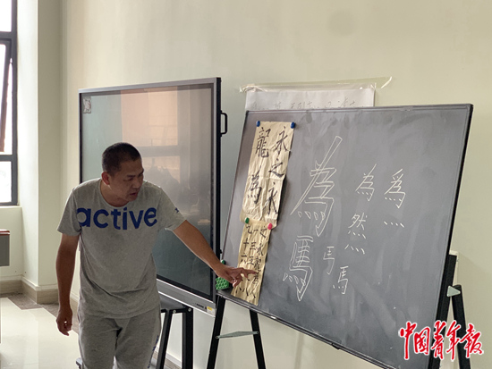 蔡偉在書法課上指導(dǎo)學(xué)生。王景爍攝