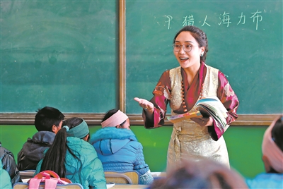 因?yàn)闊釔?,所以專注。青海省玉樹藏族自治州囊謙縣東壩鄉(xiāng)寄宿學(xué)校教師桑丁卓瑪,精心準(zhǔn)備每一堂課,認(rèn)真上好每一堂課,受到學(xué)生的喜愛。這是她在為五年級學(xué)生上漢語文課。