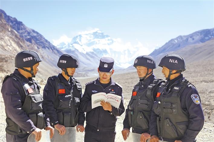 圖為珠峰邊境派出所民警們?cè)趫?zhí)勤途中開展學(xué)習(xí)。王杰學(xué) 攝