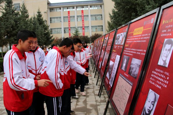 圖為甘肅省平?jīng)鍪徐o寧縣第一中學(xué)學(xué)生在觀摩“紅軍故事”展板。尹曉軍 楊葉 攝影