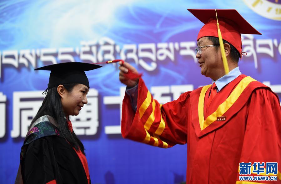 2017年11月10日,西藏大學舉行首屆博士研究生畢業(yè)典禮,向4名畢業(yè)生授予博士學位。圖為西藏大學校長紀建洲給博士畢業(yè)生張慧撥流蘇。新華社記者 覺果 攝