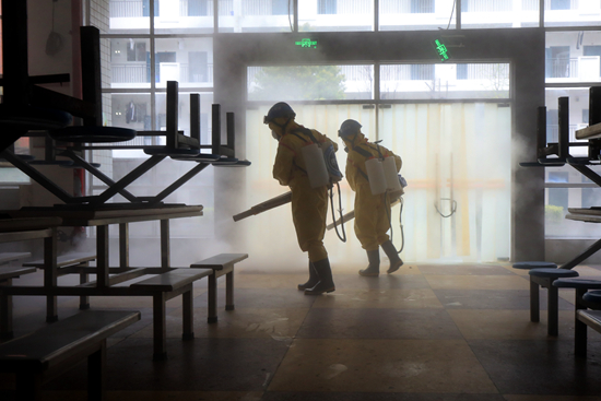 2020年3月22日,湖南省長沙市明德啟南中學,消殺防疫隊員在食堂進行例行消毒。陳澤泉/攝