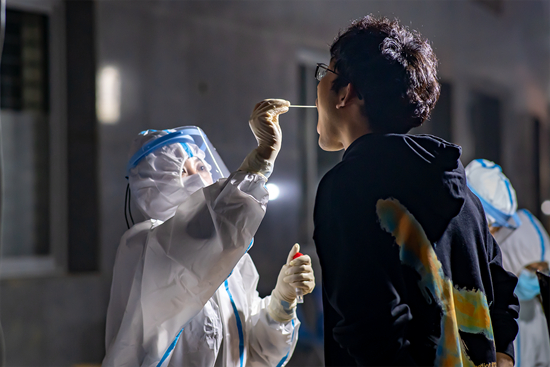 2020年10月14日,山東省青島市,中國石油大學(華東),醫(yī)護人員對學生進行核酸檢測。當日,青島新增一例新冠肺炎本地確診病例。田瑜亮/攝