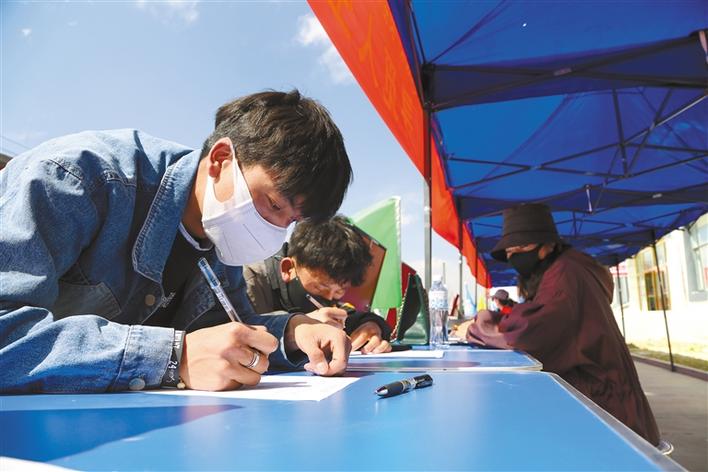 圖為瓊結(jié)籍大學(xué)生在招聘會(huì)現(xiàn)場(chǎng)填寫(xiě)簡(jiǎn)歷。倫珠澤仁 記者 洛桑 攝