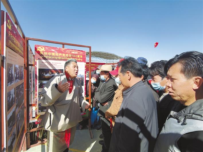 圖為在桑珠孜區(qū)甲措雄鄉(xiāng)文化廣場(chǎng),宣講員結(jié)合展板圖文內(nèi)容開展黨史學(xué)習(xí)教育宣講。汪純 攝
