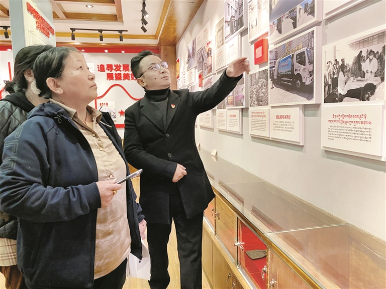 圖為在嘎瑪貢桑社區(qū)居委會“居史館”內(nèi),社區(qū)黨總支副書記、居委會主任尼瑪次仁帶領(lǐng)轄區(qū)干部群眾了解社區(qū)歷史。 拉薩融媒記者 旦增拉珍攝