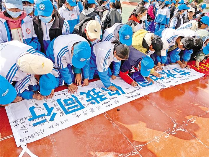 圖為學(xué)生們在條幅上簽名,許下節(jié)水愛水的承諾。錢加典 王珊 攝